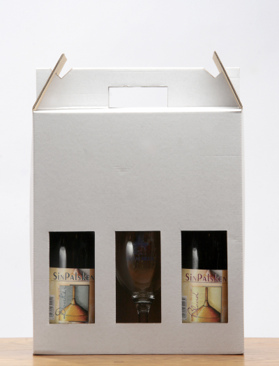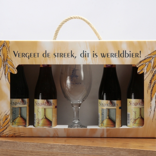 Onze andere standaardverpakking is de 2*75 cl +glas of de 3*75 cl. Deze pakketjes worden op aanvraag gemaakt en kunnen worden gevuld met naar keuze blond of donkere Sinpalsken